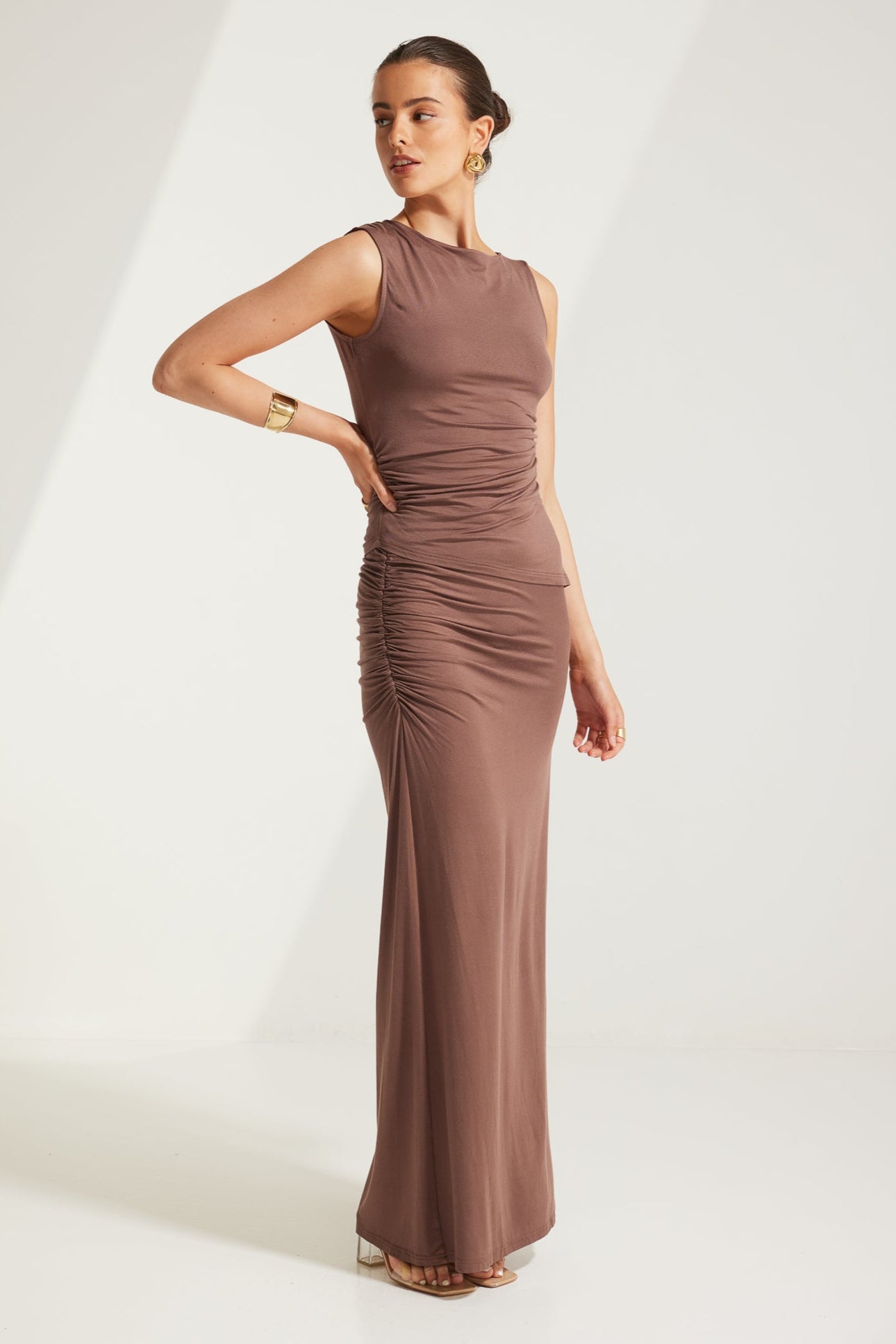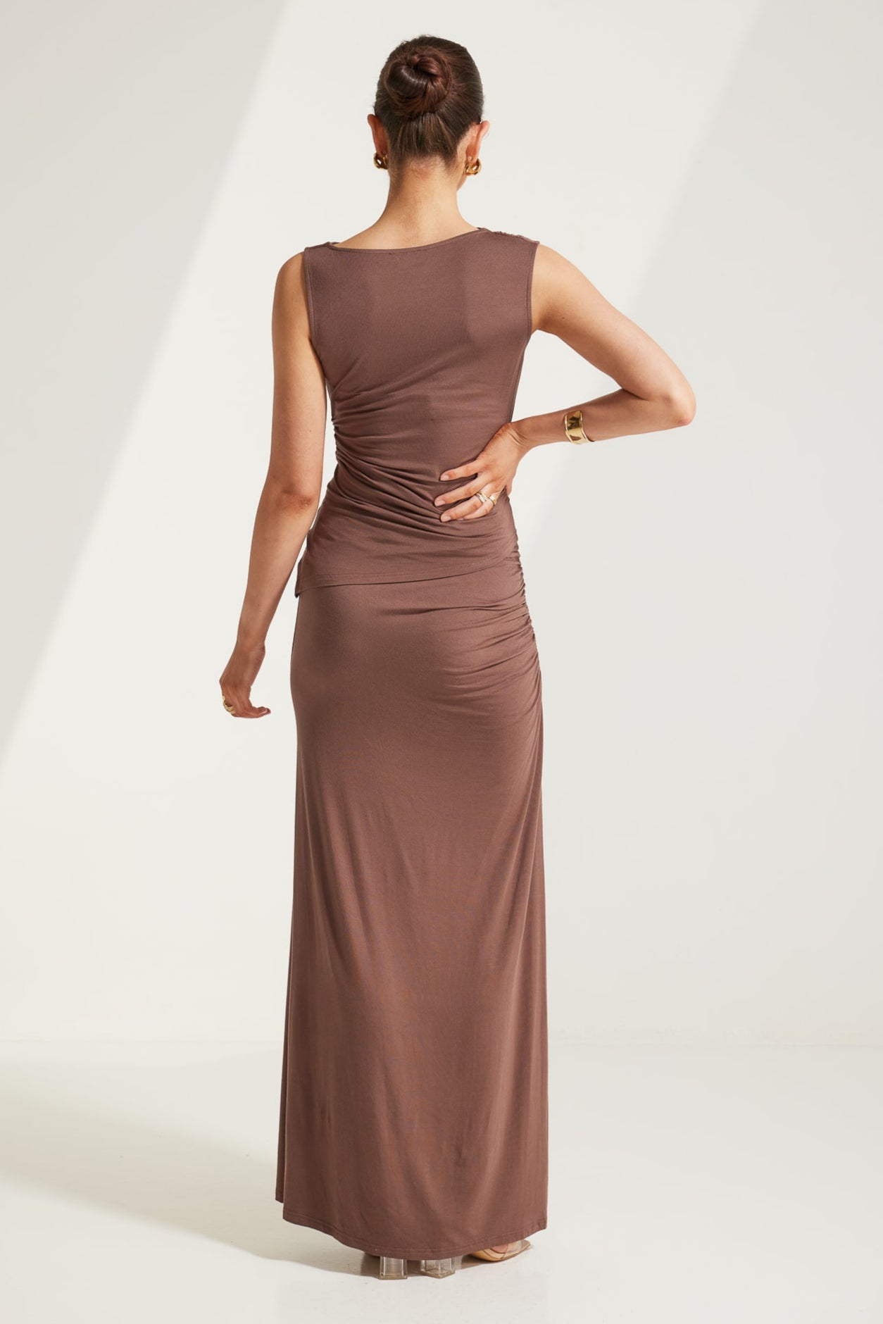 TW4218 Katelyn Ruched Side Maxi Skirt Chocolate